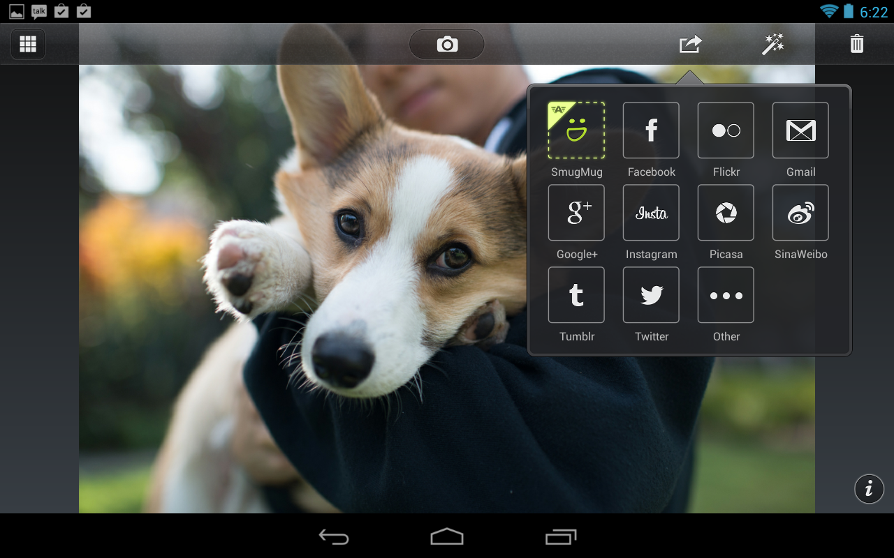 - Sharing: in addition to sharing on Facebook, Twitter, Sinaweibo, Google+, Instagram, Photobucket, Picasa, Tumblr, YouTube and Flickr, users can now share to any other services via supporting apps installed on device