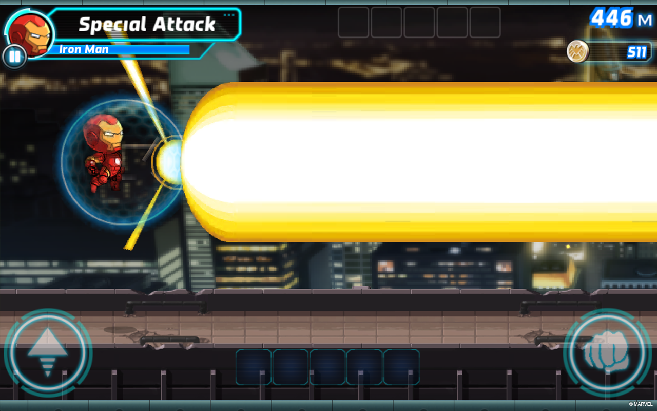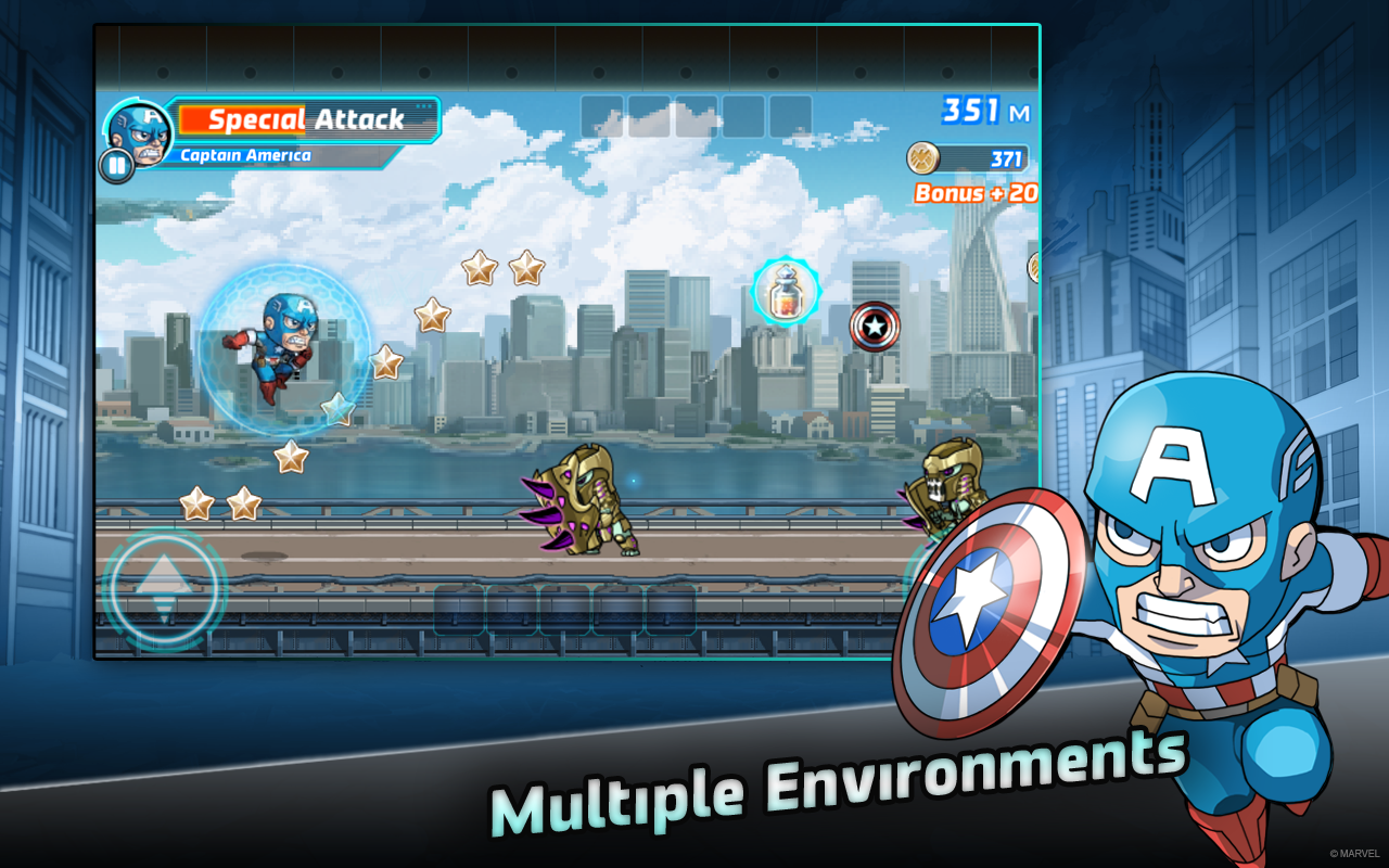 Dodge obstacles and fight Super Villains like Loki to progress as far as you can. Increase your score by switching between characters and activating each Super Hero’s unique Special Attack. Collect coins